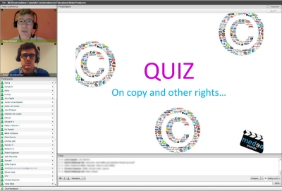 On Thursday 13 December 2012 MEDEAnet organised a live, online quiz programme with 38 participants from 10 countries learning about the most important IPR and copyright rules you have to respect when you are developing your own media content for educational purposes. Quizmaster Mathy Vanbuel (ATiT, Belgium & MEDEA/Media & Learning Association) and main jury member Jeroen Verschakelen (ICRI - KULeuven) are still available to answer copyright-related questions in the Media & Learning Community of Practice until the end of this year.
