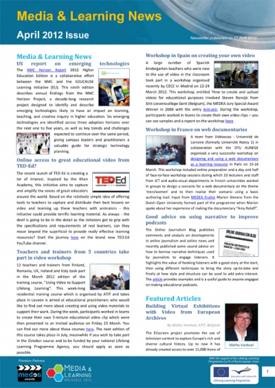 We have just published the April issue of Media & Learning News, which includes an article about Building Virtual Exhibitions with Video from European Archives, and news from the MEDEA Awards as entries are now welcome until 17 September 2012.