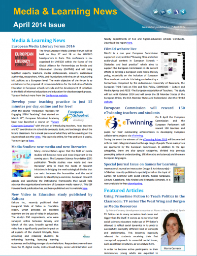 Highlights include an article on Using Primetime Fiction to Teach Politics in the Classroom by Maria Cervera, an article on the Eurovision Academy Master Class on Digital Media Literacy by Nathalie Labourdette, an article on Building Media Literacy Skills via Hands-On Production Experience by Julia Griffey, news articles about the first keynotes for Media & Learning conference 2014, about the Media & Learning Association webinars and plenty of other news, notifications and announcements related to the use of media in education and training.
