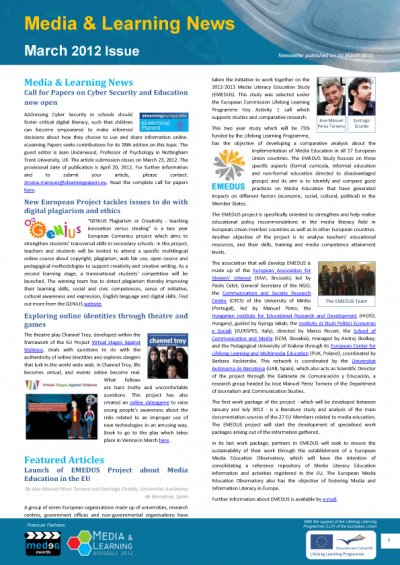 Articles in this month's multilingual issue announce the launch of EMEDUS Project about Media Education in the EU, the themes and topics of the Media & Learning Conference and include a feature article about using media to support the transition of research to education in higher education. This publication also highlights a new European Project tackling issues to do with digital plagiarism and ethics, a film competition promoting solidarity between generations and showcases Simply Music – ‘Highly Commended’ at the MEDEA Awards 2011. You can find plenty of other interesting news, notifications and announcements related to the use of media in education and training here. This issue is available in English, French, German, Italian, Polish and Spanish.
