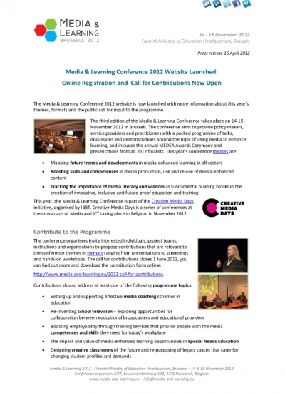 A press release announcing the relaunched website of the Media & Learning Conference 2012 was published this morning. The press release, which you can download online, includes a reminder of the call for contributions closing 1 June 2012 and more information on the conference themes.