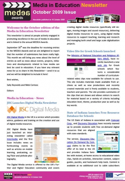 The October issue of the Media in Education Newsletter highlights the launch of the new Greek ministerial video web site for schools, the new JISC Digital Media Newsletter and the way Swedish schools are using media resources.