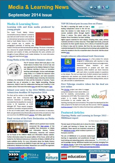 Highlights of this month include an article by Tânia Vargas about charting Media and Learning in Europe 2013 in the MEDEAnet report, an article by Ilkka Kukkonen about studying with recorded lectures and an article about inspiring master students that improve their field research using iPads and a 4G network by Sylvia Moes. Also read and download a book by Media Visions about learning with and from media produced by young people, check out the Media & Learning agenda, take part of the MEDEA Awards by submitting an educational media project before 30 September, read the news about the launch of a new contest by Inspiring Science Education (ISE) and much more.