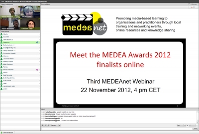 On 22 November 2012 the third MEDEAnet webinar took place, in which the two award winners of the MEDEA Awards 2012, Petros Michailidis (5th Primary school of Alexandroupolis, Greece) and Catherine Loire (TICE, Paris 1 Pantheon-Sorbonne University, France) presented their entries. 25 participants participated in this webinar, the first of a series called 'Meet the MEDEA Awards 2012 finalists' aiming to share good practices on producing and using educational media. You can now view the recording and presentations here.