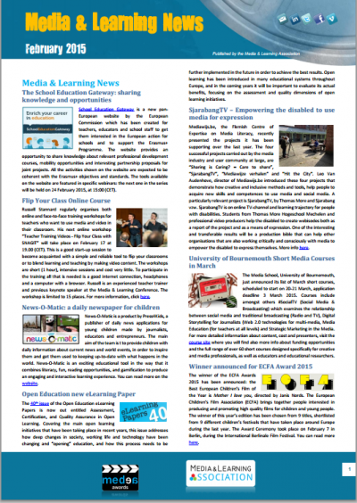 Highlights in this month's newsletter include an article on Media and information literacy (MIL) at UNESCO by Georges Boade from UNESCO, an article on EDIT2014: A Finnish, Austrian and German Video Pedagogy Collaboration by Janne Länsitie and Blair Stevenson from Oulu University of Applied Sciences (Finland), an article on Using Open Media Archives by Theo Kuechel, Education Consultant (UK), news articles about the series of M&L webinars, the opening of the School Education Gateway, and plenty of other notifications and announcements related to the use of media in education and training.